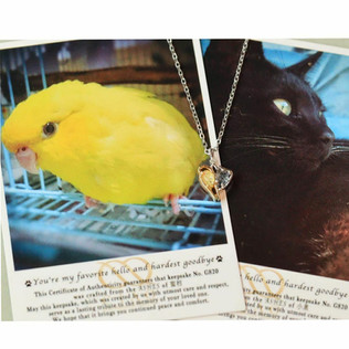吊墜中含有兩顆主石,分別是放了小鳥和貓咪的骨灰,